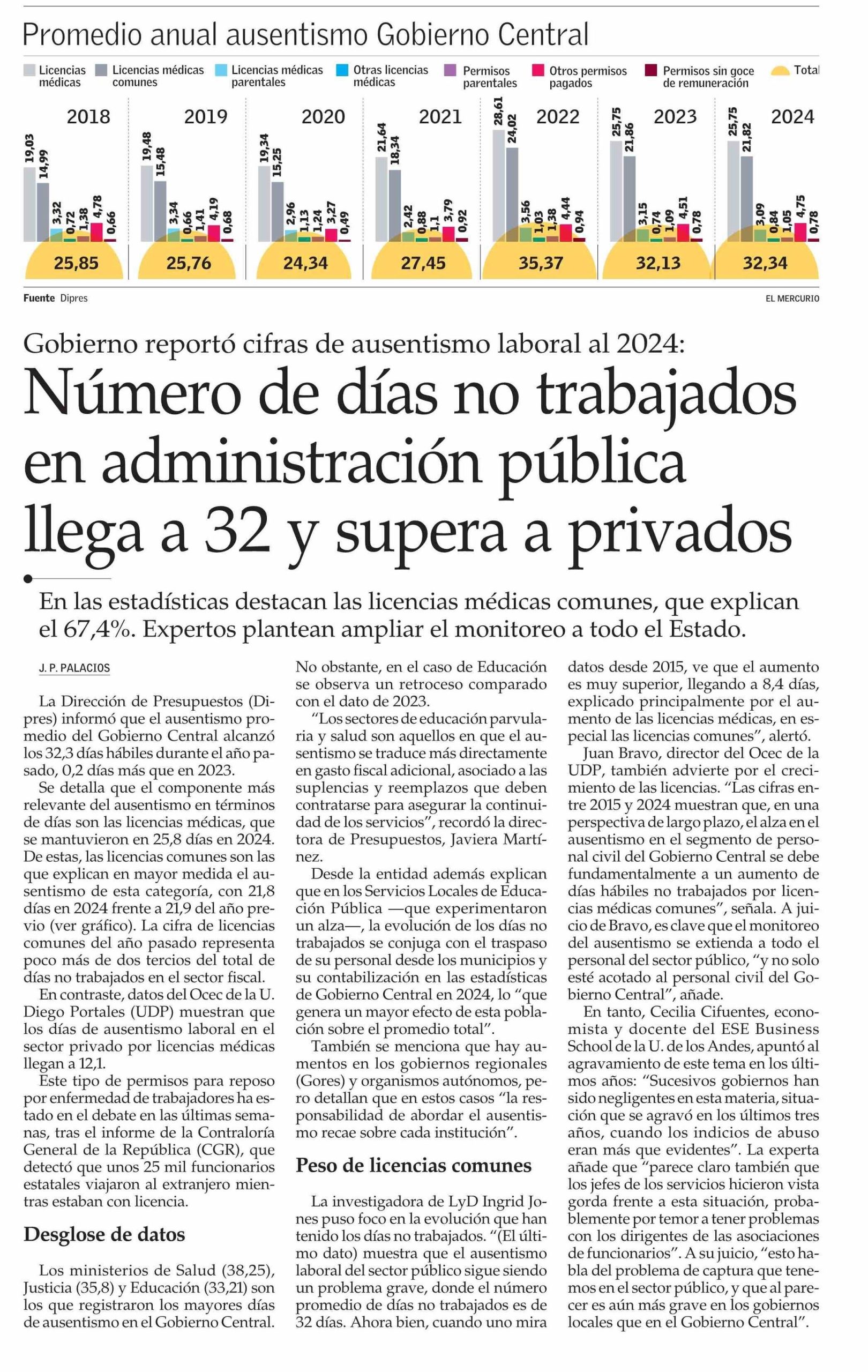 Juan Bravo, director del OCEC-UDP, analizó en El Mercurio el alza del ausentismo laboral en el sector público