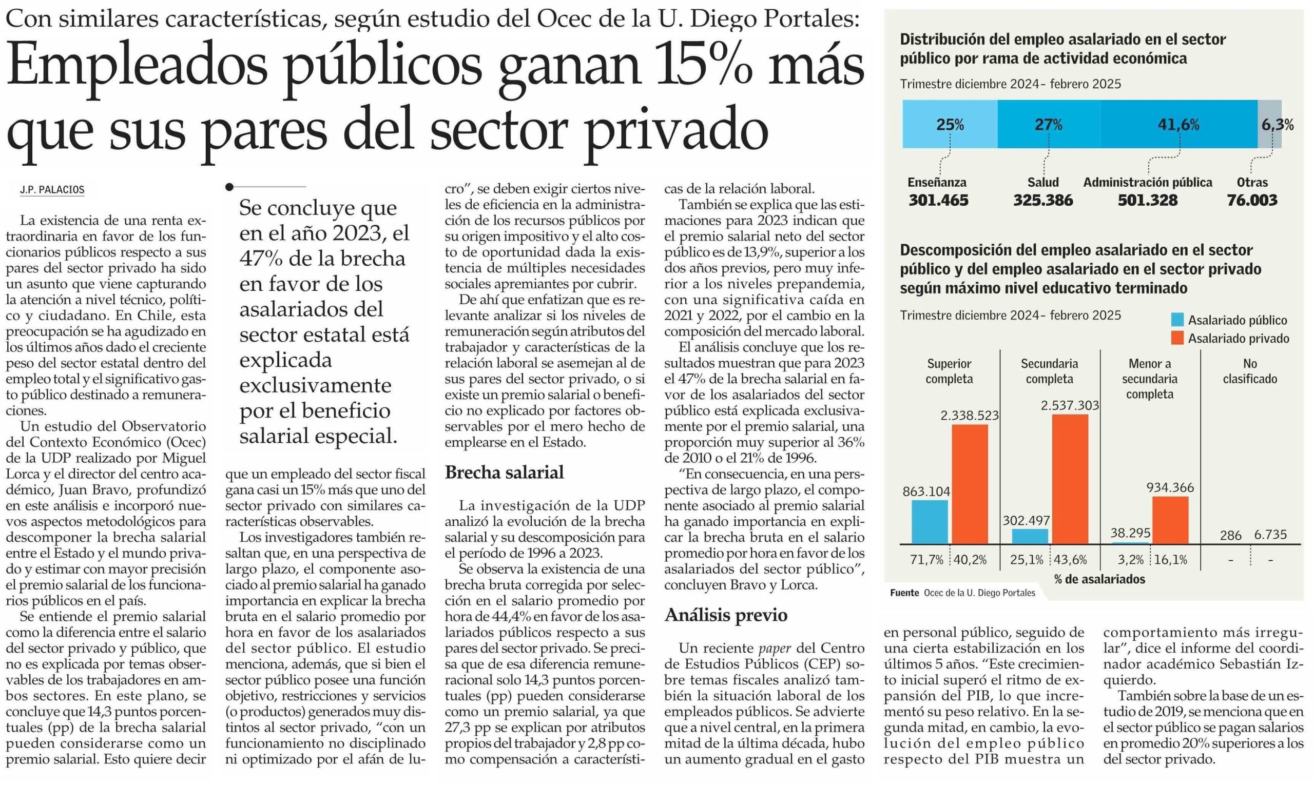 Juan Bravo y Miguel Lorca, economistas del OCEC-UDP, analizaron brecha salarial entre el sector público y privado en estudio destacado por El Mercurio